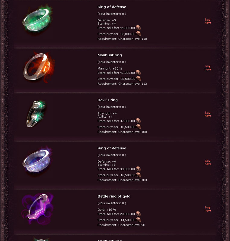 - Il y a fondamentalement 3 catégories d'anneaux : de chasse, de combat/or et un anneau qui améliore les caractéristiques de base de votre personnage au combat. Seul le meilleur anneau de chasse ou de combat/or que vous possédez est employé pour calculer votre bonus et seulement un de chaque type peut être porté. Les anneaux qui améliorent vos caractéristiques pendant les combats sont également choisis en fonction de votre niveau ; là aussi, un seul anneau est pris en compte. De ce fait, acheter plusieurs anneaux n'augmentera pas votre bonus. Si vous voulez tirer profit de tous les types d'anneaux, achetez le meilleur anneau de combat/or, le meilleur anneau de chasse, le meilleur anneau défense et le meilleur anneau du Diable OU selon que vous vouliez vous avoir un bonus lors d'attaques (anneau du Diable) ou de défenses (anneau de défense), les deux premiers meilleurs anneaux de l'une ou l'autre des compétences.